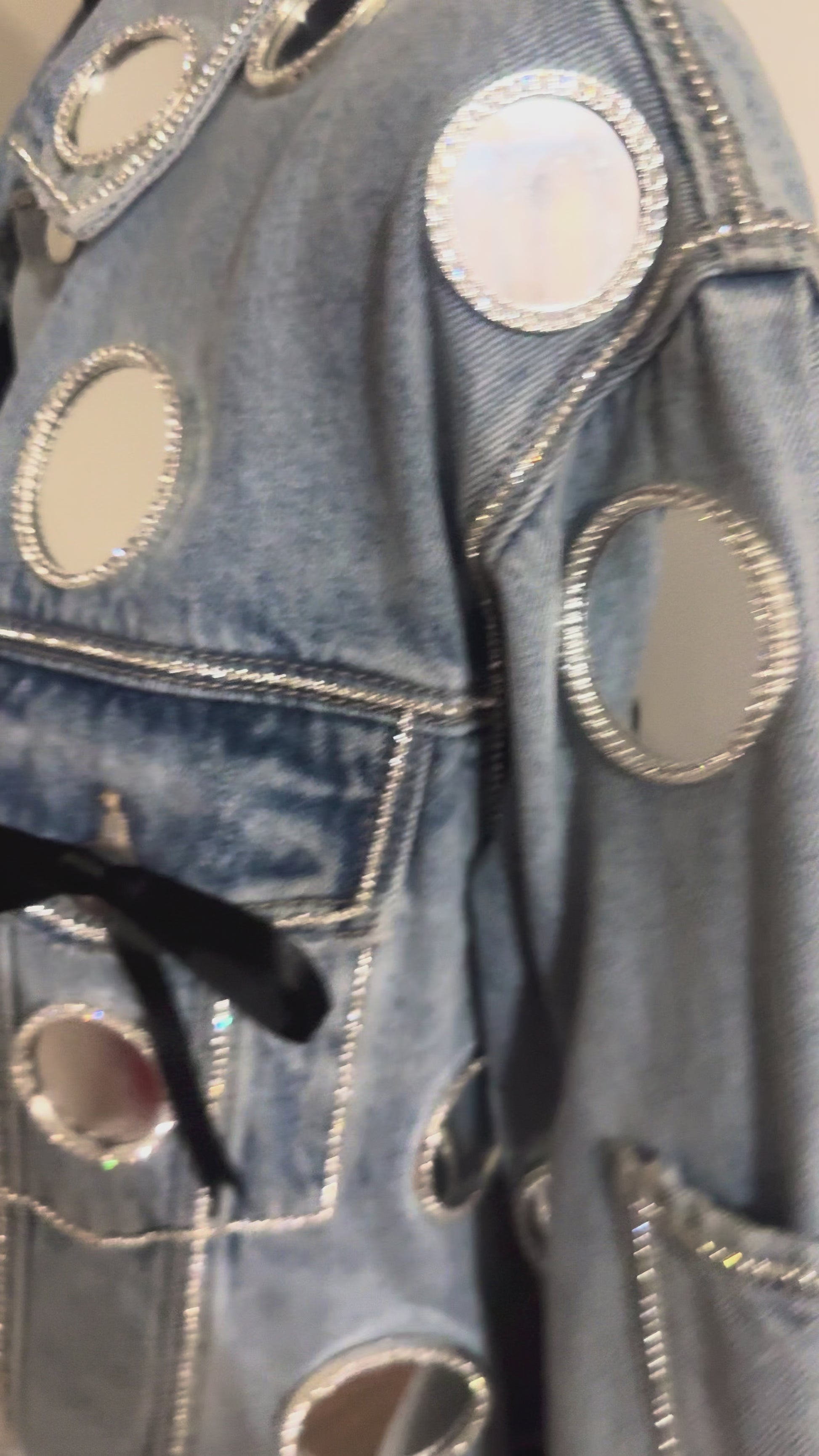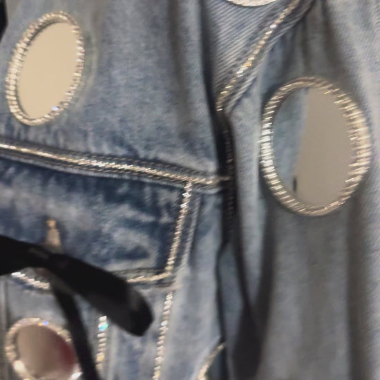 Our Spotlight jacket will be the star of the show with its dazzling rhinestone-edged mirror circles, shimmering rhinestone details, and adorable black bows for an extra touch of cuteness!